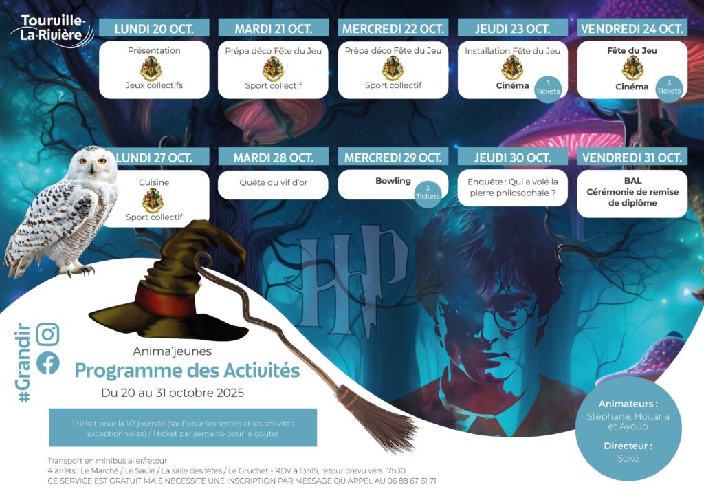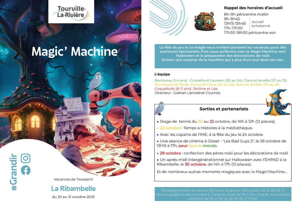 Jeunesse : programmes des vacances de la Toussaint Anima’jeunes et la Ribambelle vous accueillent durant les 2 semaines des vacances de la Toussaint. Alors découvrez sans plus tarder ce qui vous attend ! Vos vacances à la Ribambelle Vos vacances à Anima'jeunes Précédent Aire de grands passages : rassemblement jeudi 16 octobre à 18h30 devant la mairie Suivant La Fête du jeu 2025 sur le thème de la magie