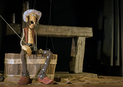 Spectacle de marionnettes à fils, drôle et déjanté comprenant un solo « Dragons et grenouille » suivi d’un duo (duel ) intitulé « Western ». Comme un dessin animé animalier, les personnages sortent de leur coffre jouent avec nos vielles peurs, nous replongent dans les contes de notre enfance. Gentiment impertinents, ils font rire les tous petits comme les adultes et provoquent notre tendresse…
